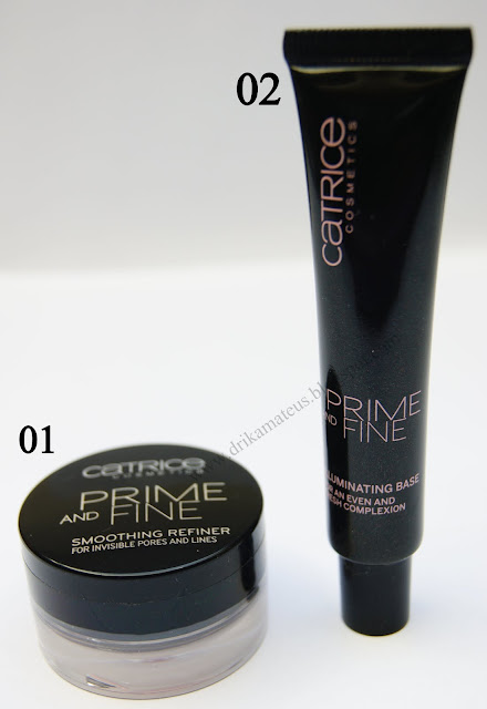 "prime and fine". O 01 na foto abaixo é um "primer" que esconde os poros e as linhas de expressão. O 02 também é um "primer" para o rosto que ilumina e ajuda a fixar a maquiagem, sua fórmula contém componentes anti-envelhecimento (vitamina A, C e E ).